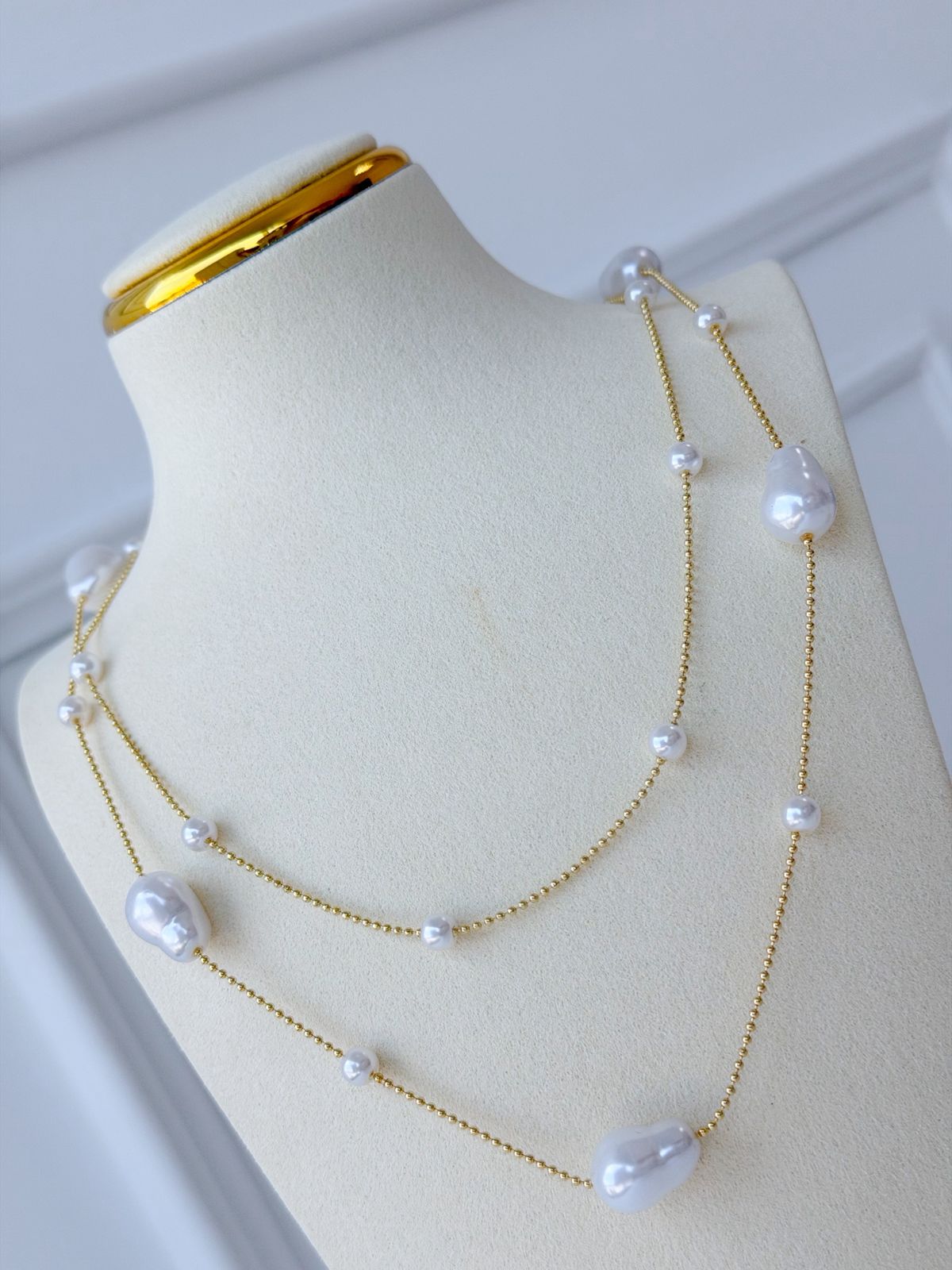 Fabricado en cobre con baño de oro y perla